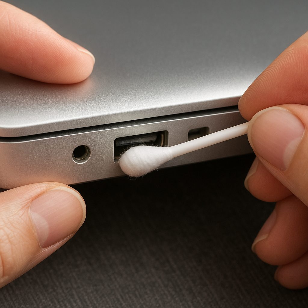 Nasącz wykałaczkę lub pałeczkę izopropanolem i ostrożnie przetrzyj wewnętrzne ściany portu oraz styki. Wilgoć odparuje w ciągu kilkunastu sekund, jednak warto odczekać około minuty przed ponownym uruchomieniem urządzenia.
