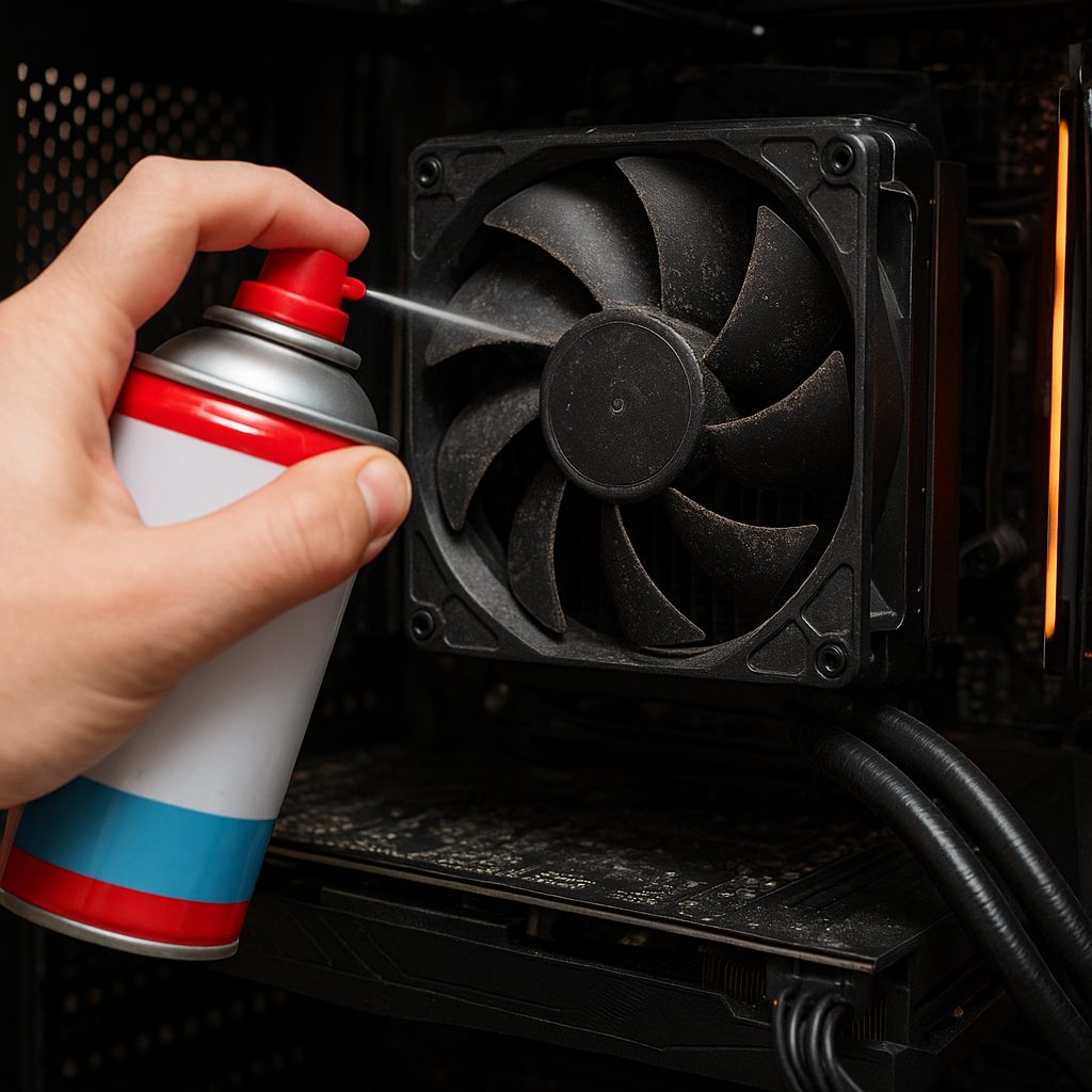 Używając puszki ze sprężonym powietrzem, wyciśnij krótkie strumienie przeciw kurzowi z zachowaniem odległości co najmniej 10 cm od powierzchni elementów. W przypadku mocno zakurzonych żeberek radiatora skieruj powietrze pomiędzy szczeliny, wydmuchując pył na zewnątrz obudowy. Do trudno dostępnych miejsc użyj miękkiej szczoteczki, delikatnie odgarniając kurz. Na wentylatorach usuń resztki brudu z łopatek, przytrzymując je, by nie kręciły się przy każdym dmuchnięciu.