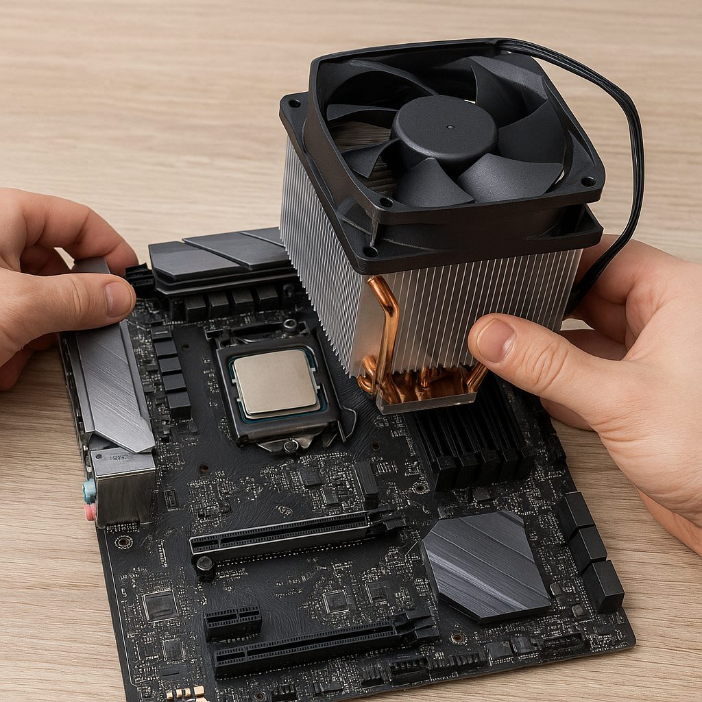 - Przyłóż radiator z wentylatorem, dociskając centralnie, aby pasta rozprowadziła się równomiernie.